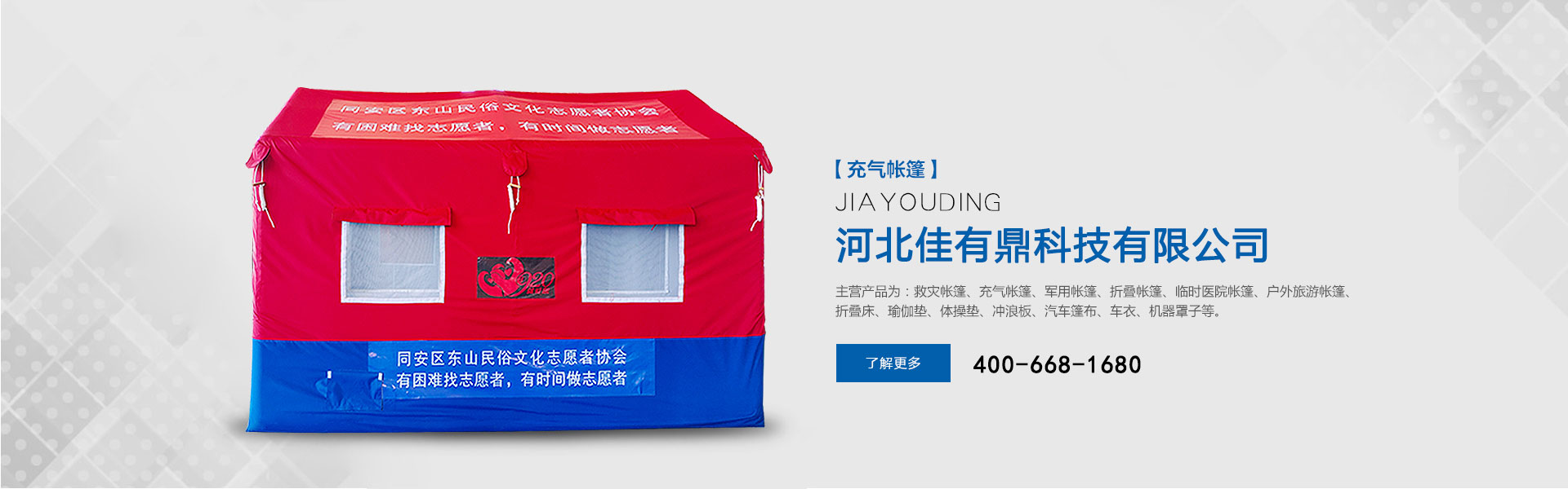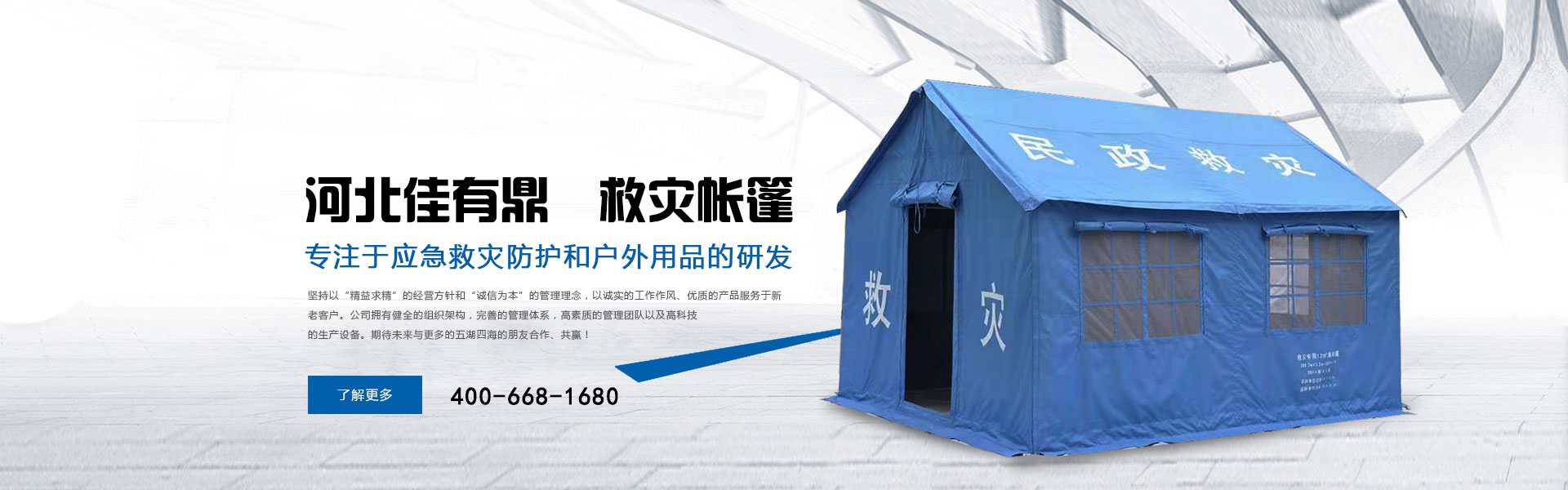河北佳有鼎科技有限公司原為北京五環(huán)精誠(chéng)帳篷有限責(zé)任公司多年來專注于應(yīng)急救災(zāi)防護(hù)和戶外用品的研發(fā),是一家集研發(fā)、設(shè)計(jì)、生產(chǎn)、銷售、服務(wù)于一體的綜合型公司。